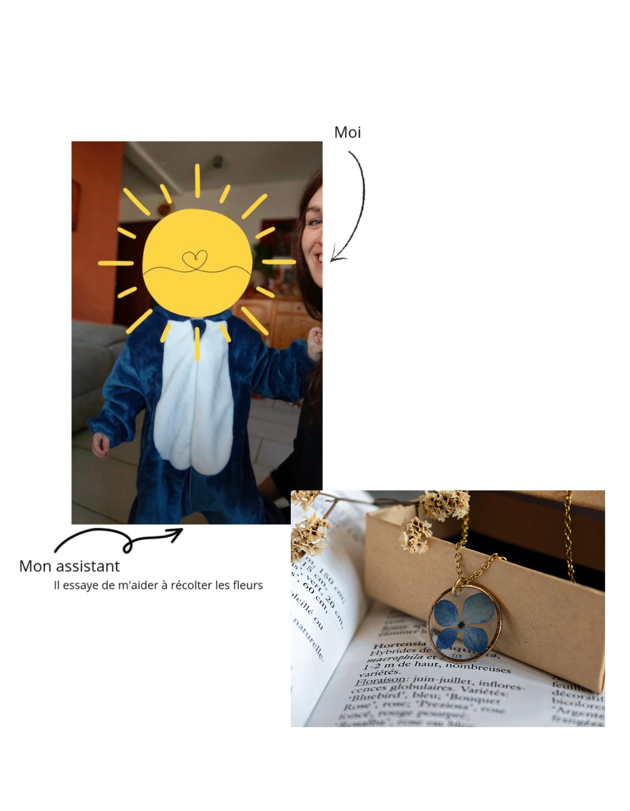 Chaque bijou contient une véritable fleur séchée qui raconte une histoire et vous invite à l'évasion et à la (re)connexion à la nature.