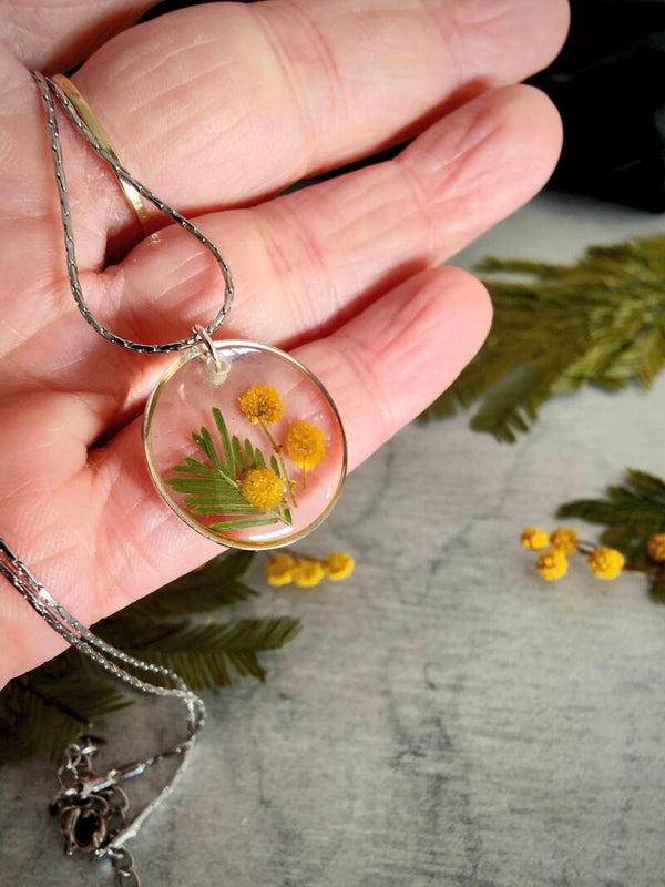 DERNIERE PIECE ❧Collier Mimosa - fleurs et feuilles - Acier inoxydable argent - Rond