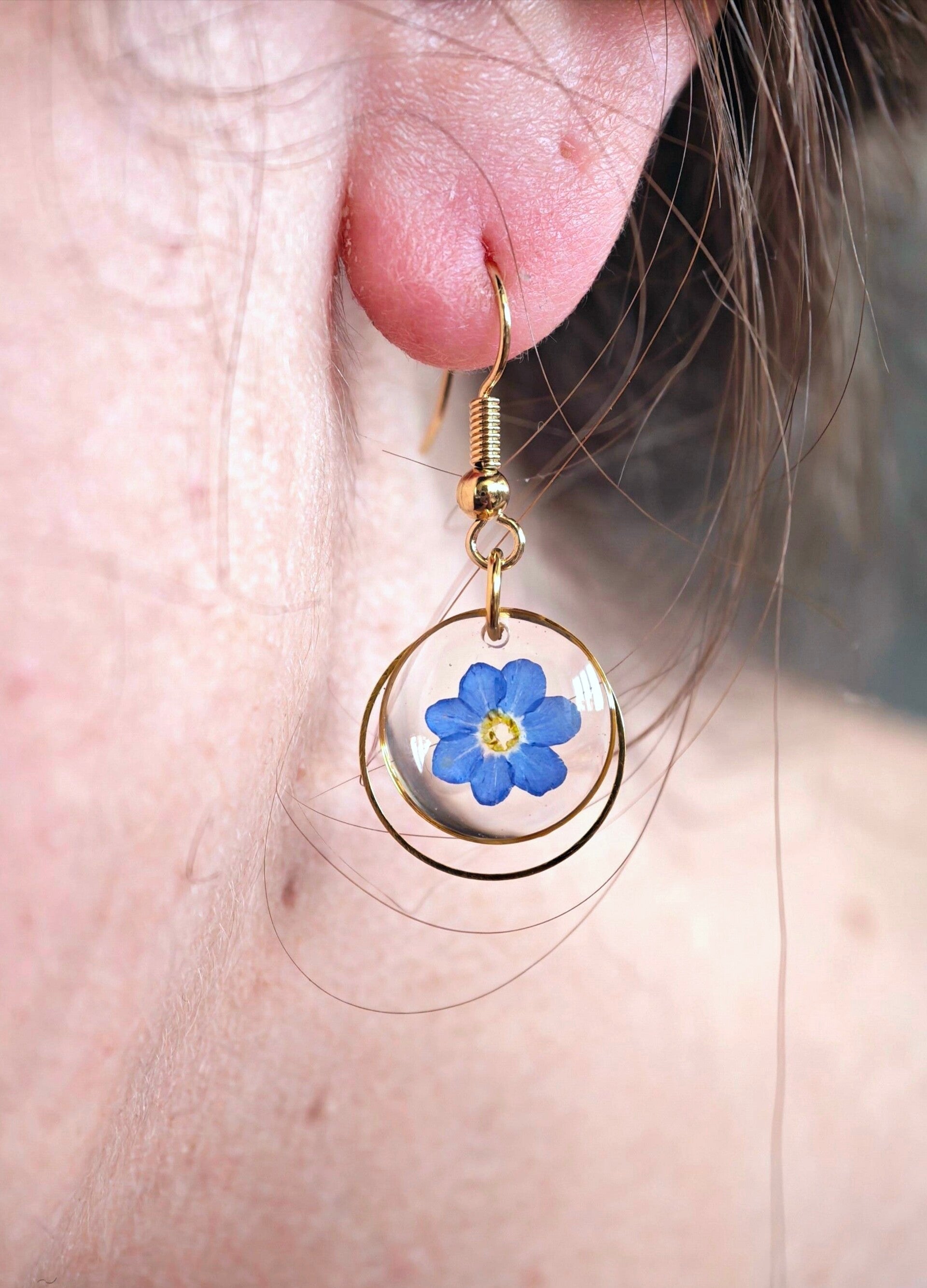 Ces boucles d'oreilles sont composées de fleurs séchées de Myosotis -Myosotis sylvatica